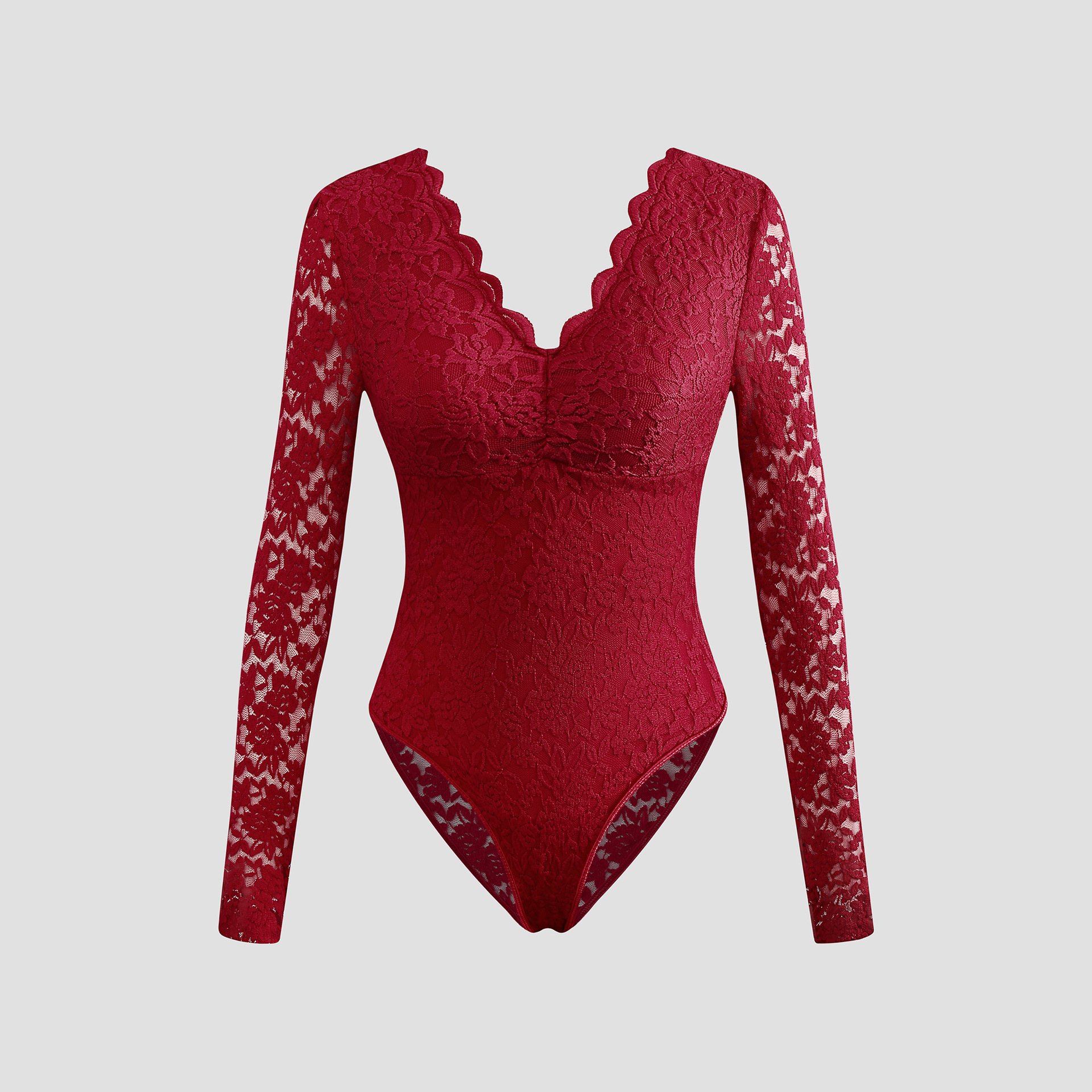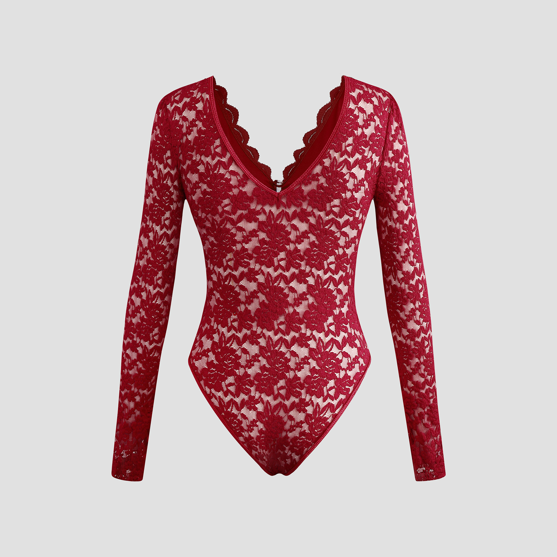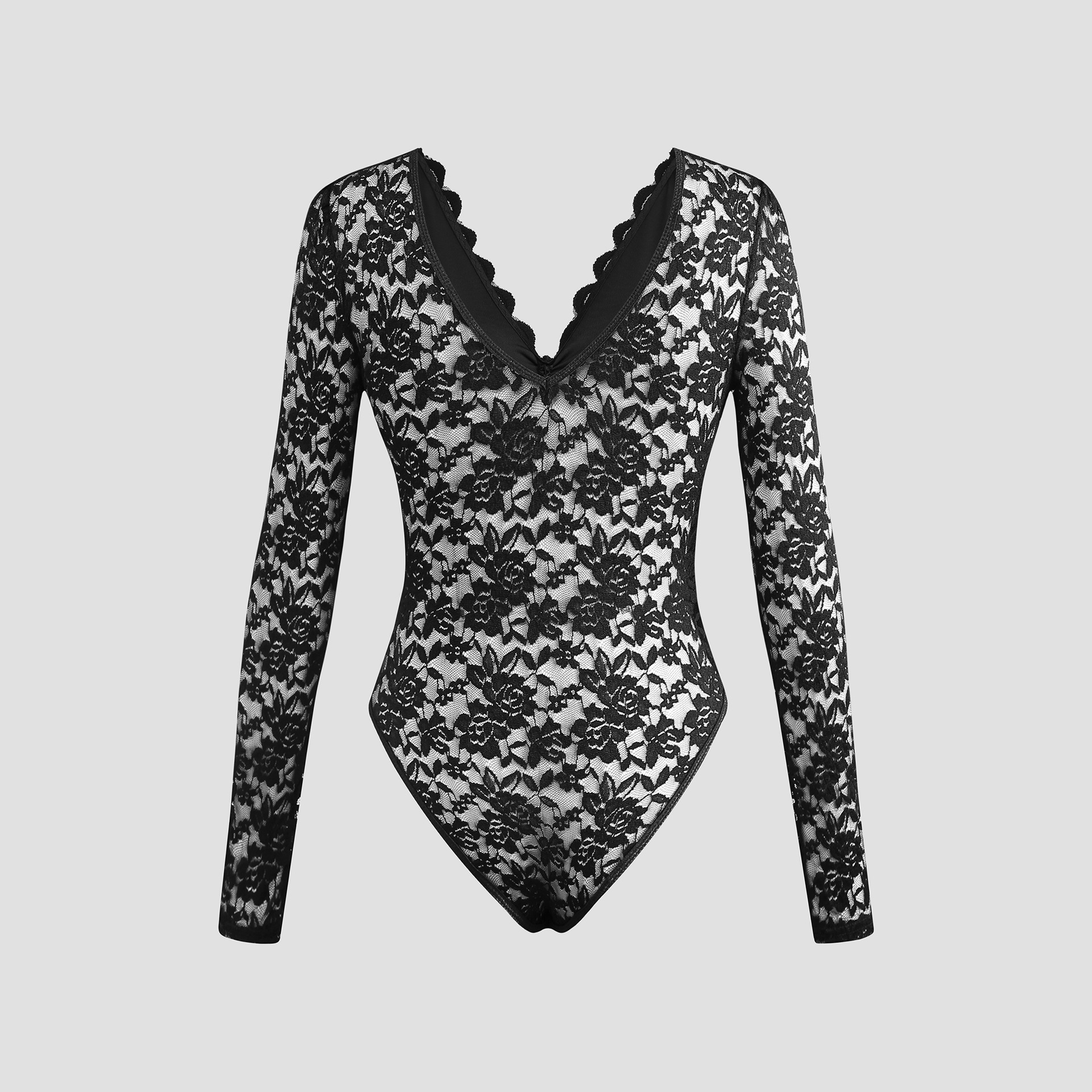 Sexy Solid-Color Lace Long-Sleeve Sheer Bodysuit